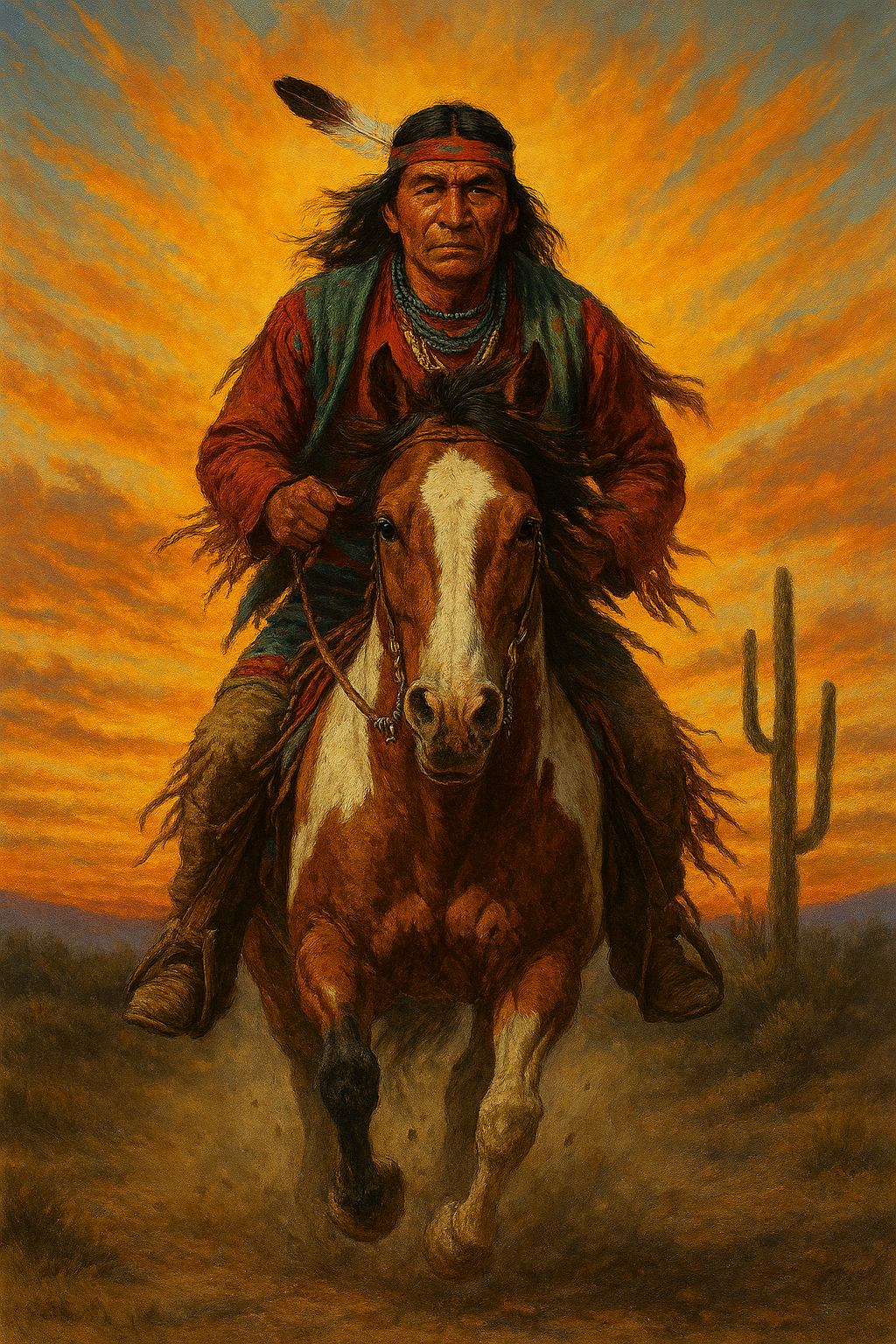 The Rider is not just a man on a horse—he is the ancestral spark galloping through time. His urgency is your own: the need to begin, to honor the past by moving forward, to carry the fire of tradition into new terrain. The desert is not barren—it is sacred ground, cleared for your arrival. The cactus stands as a sentinel, reminding you that resilience blooms even in harsh conditions. The sunset is your backdrop, but the dawn is your destination. To follow the Rider’s path is to embrace your role as the initiator, the one who breaks silence, starts movement, and honors the ancestors by becoming one.